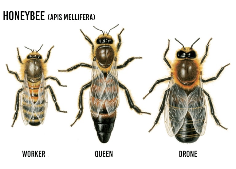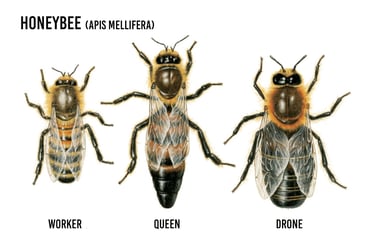 Drones—Drones are stingless male honey bees that are only present in the spring. Their head, eyes and thorax are significantly larger than those of the females. They are unable to feed without assistance from worker bees and do nothing within the hive. A drone's only role is to mate with an unfertilized queen from a different colony.