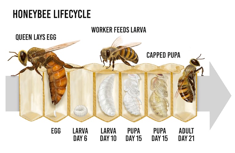 *Worker and queen bees are raised from a fertilized egg. Drones form from an unfertilized egg that is deposited in a different, larger cell. Both Queen and drone lifecycles differ by stage and duration