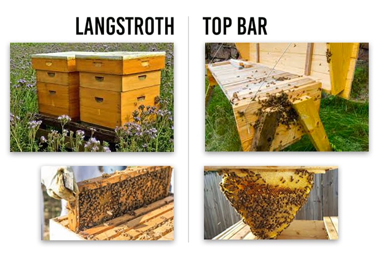 Top Bar: These are becoming more and more popular with beekeepers, especially in more urban areas. In these hives. Unlike Langstroth, they are frameless, horizontal hives where bees build and hang freeform comb off of top bars. One con of the top Baar hive is, since the bars are frameless, the entire comb needs to be removed in order to extract honey.
